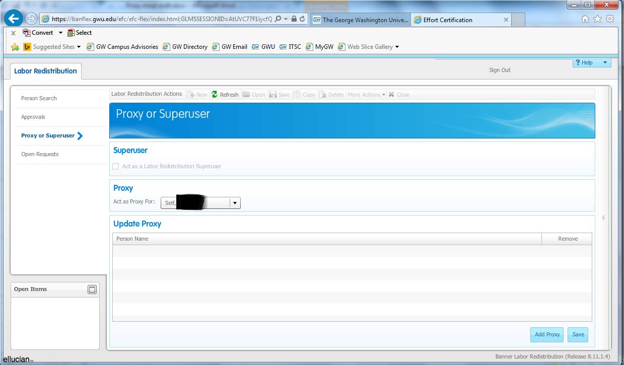 You have a situation in which you want to delegate your signature approval while you are out of the office. First, make sure the person you want to assign has access in Banner by following the steps in ‘Getting Access to Labor Redistributions’ above. In GWeb under Labor Redistributions you update your proxies by accessing the “Proxy or Superuser >” menu item. Select the ‘Add Proxy’ button in the bottom right corner and type in the person’s name and set the proxy. Remember to Save your request and exit the system using the Sign Out button. When you come back to the office, you can go in to remove the proxy/delegation.